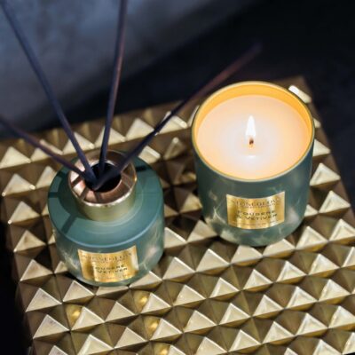 MAY CHANG & RHUBARB Refreshing may chang, infused with orange and grapefruit, sits on a bed of tart pink rhubarb balanced with the sweetness of figs. Warming notes of cedarwood and musk combine for an indulgent aroma.